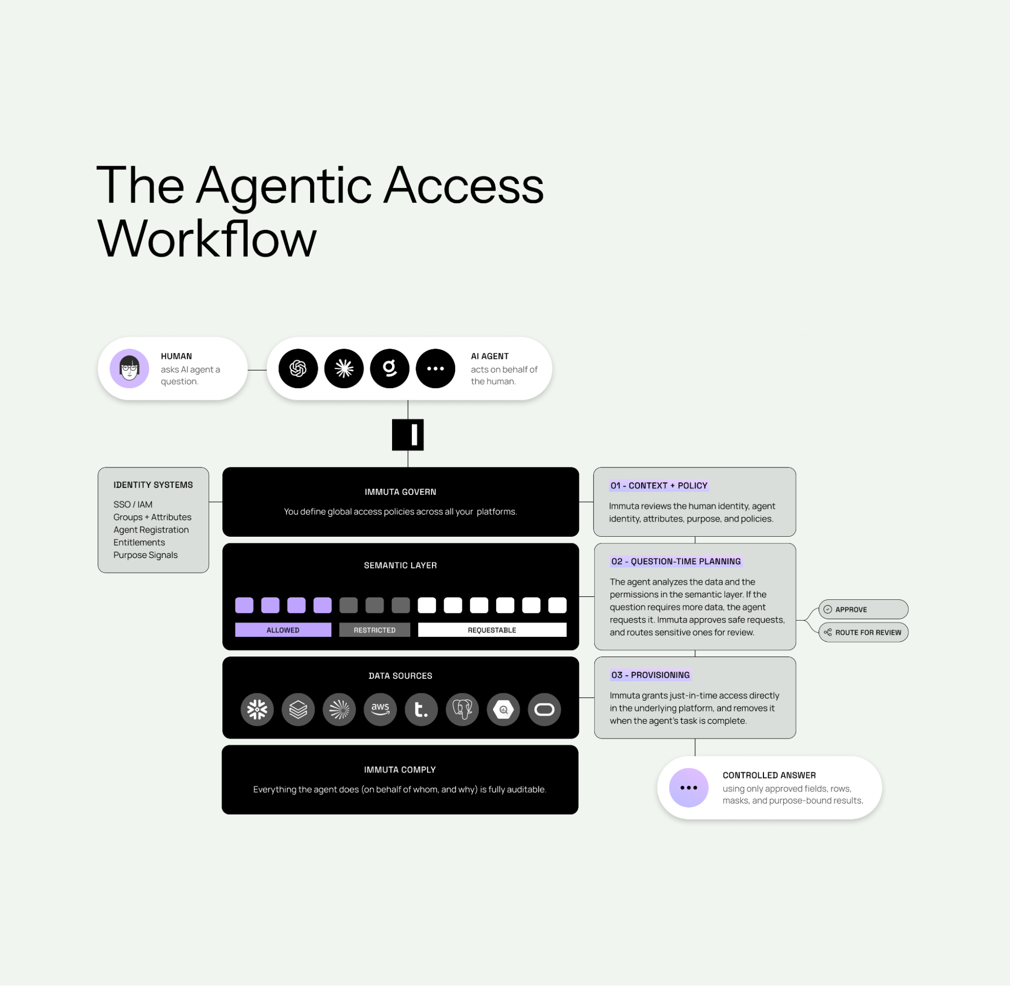 AI agents do not operate within the limits of traditional human-scale access models. They move at machine speed, act continuously across systems, and increasingly operate on behalf of users. That creates a new enterprise challenge: how to make agent-driven access policy-driven, temporary, and auditable without falling back on static roles, impersonation, or ticket queues. Immuta addresses that challenge by extending data provisioning to support both human and non-human identities.