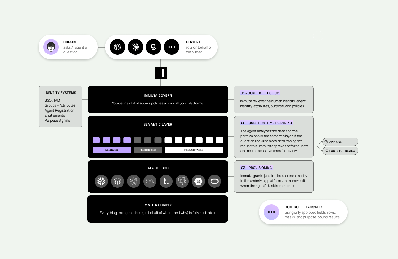 That architectural choice matters now more than ever. Agentic access cannot be governed reliably from a layer that sits above the data and guesses. Policy has to perform in real time, provision access just in time, and leave behind a clear audit trail in the underlying data platforms where enterprise governance actually lives.