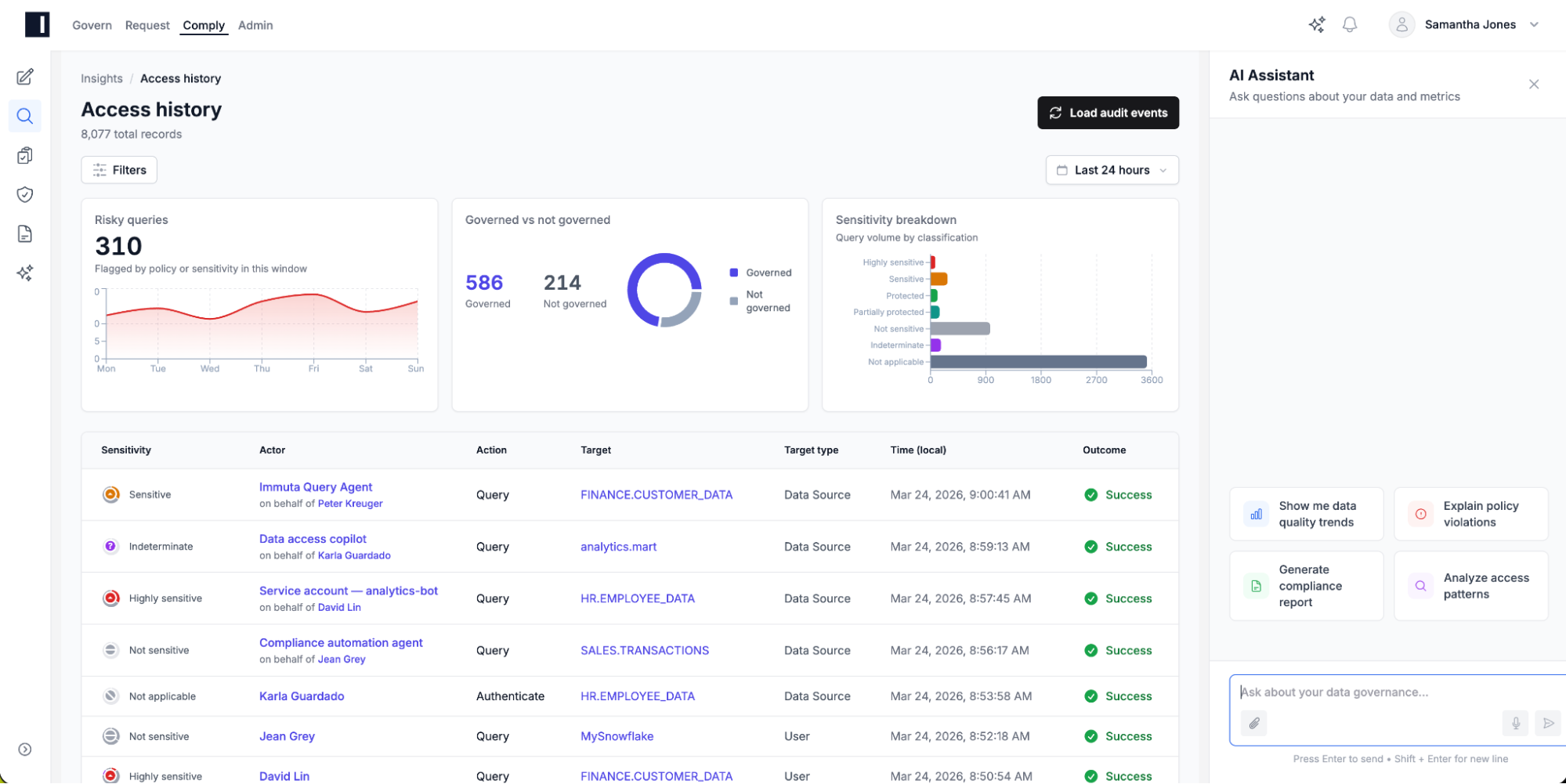 This is a fundamentally different model than pushing authorization decisions up into the LLM tier and hoping for the best. Immuta enforces deterministically at the data platform tier, where governance has to be real, provable, auditable, and fast enough to keep up with machine-speed workflows.