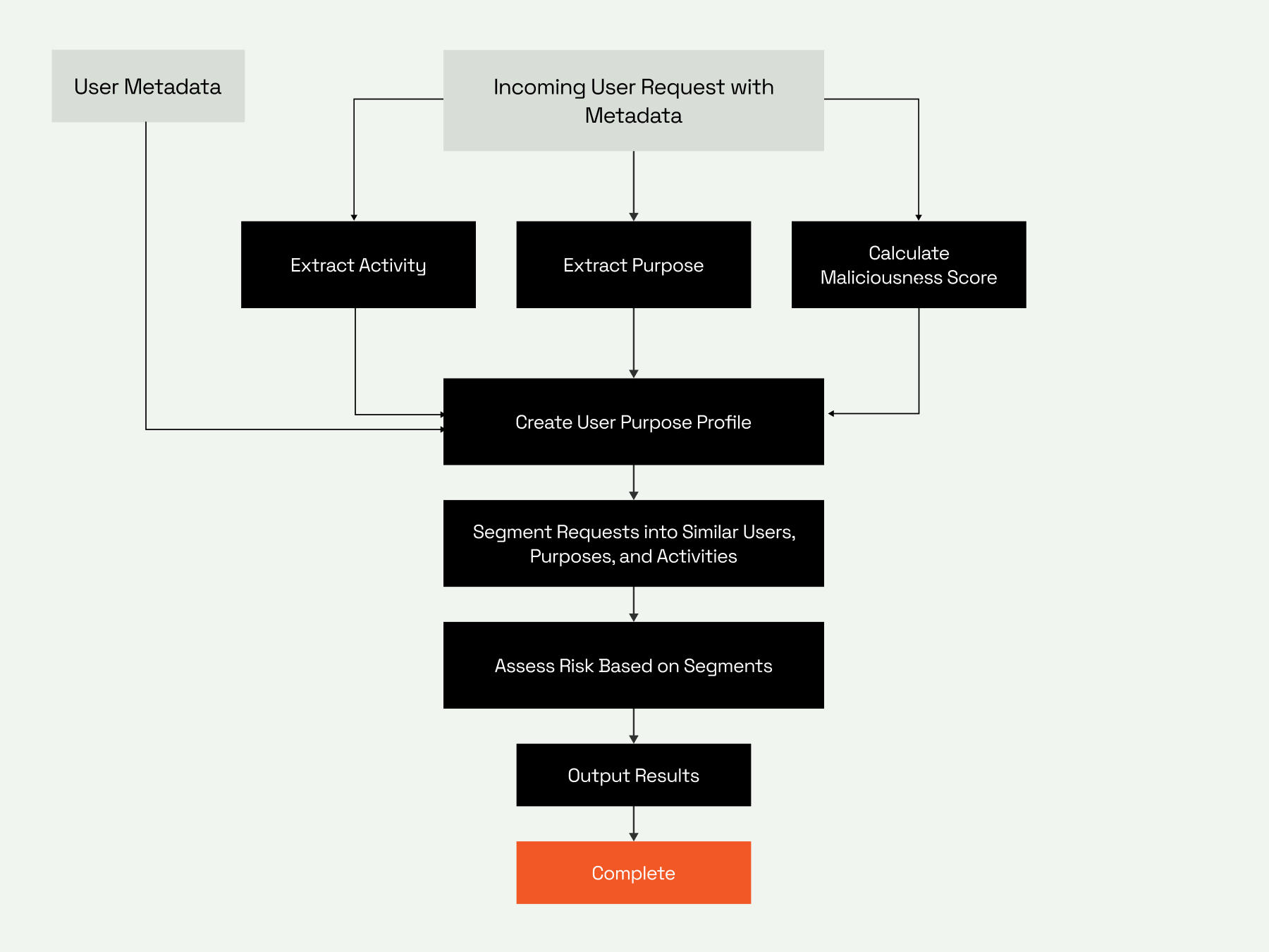 After classification, the LLM also calculates a simple Maliciousness Score as a final safety check. This score evaluates the verb used, flags clearly harmful or suspicious phrasing, and increases slightly when the purpose or action is unclear. While not part of the primary scoring model, it ensures that requests containing obviously risky language are surfaced for additional attention.