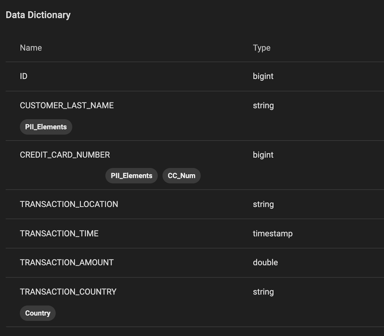 In the example below, Immuta scanned and found PII and PCI data. Since the country column is specified in the policy above, Immuta automatically tagged that attribute so the policy is applied.